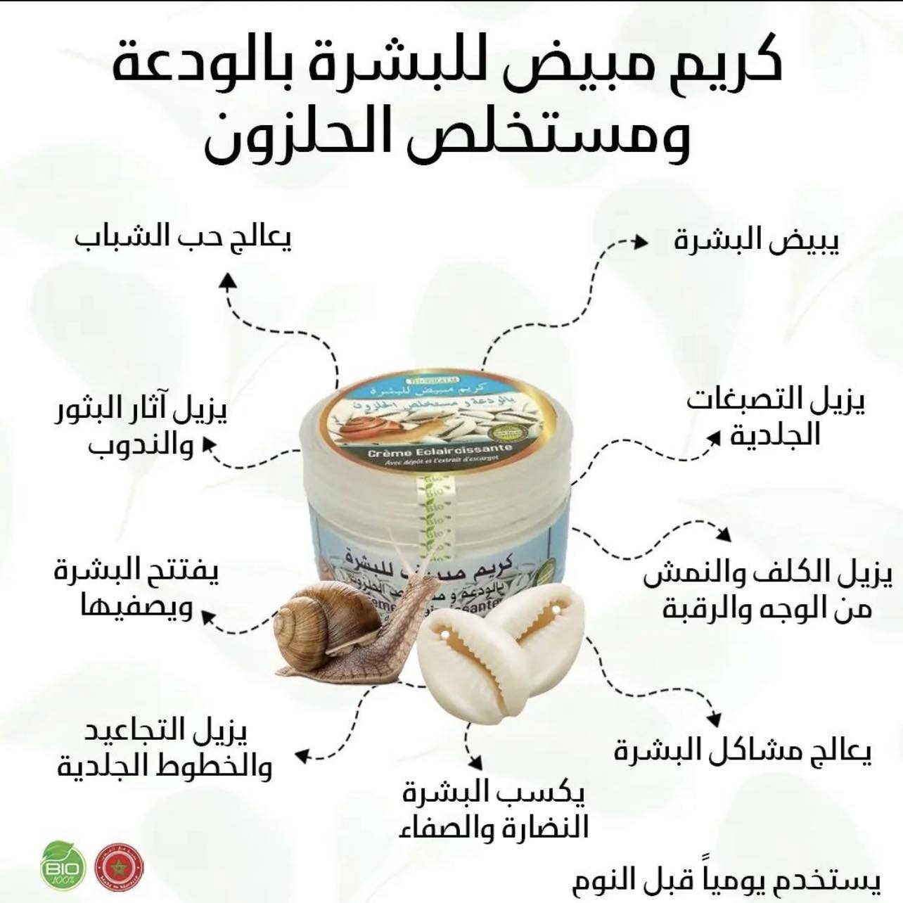 كريم الودعة ومستخلص الحلزون كريم مبيض للبشرة بالودعة ومستخلص الحلزون: مبيض طبيعي للبشرة. يزيل التصبغات الجلدية. يزيل الكلف والنمش من الوجه والرقبة. يعمل على إزالة التجاعيد والخطوط الجلدية.