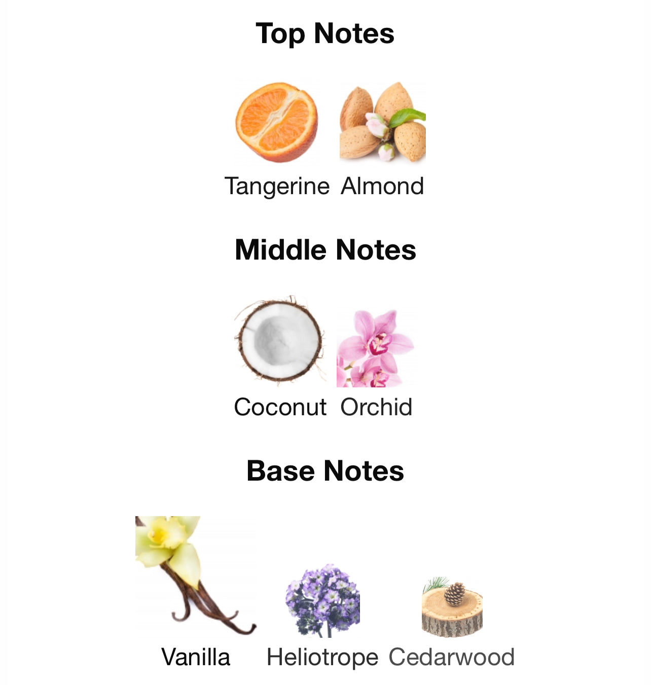 Top notes are Tangerine and Almond; middle notes are Coconut and Orchid; base notes are Vanilla, Heliotrope and Cedarwood.